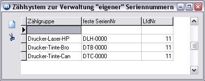 Die Zählgruppe wird einer Warengruppe oder einzelnen Artikeln zugeordnet. In dem Beispiel würden - bei automatischer Seriennummern-Vergabe - die Seriennummer eines Artikel, dem die Zählgruppe „Drucker-Laser-HP“ zugewiesen wurde, „DLH-0011“, „DLH-0012“, „DLH-0013“ usw. lauten.