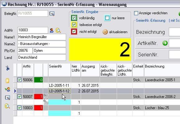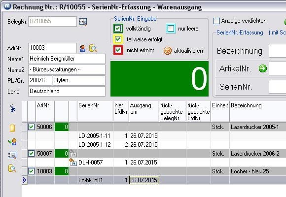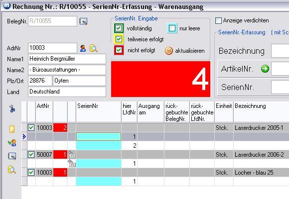 Nachdem Sie z. B. eine Rechnung mit "2 x Laserdrucker 2005-1" und "1 x Laserdrucker 2006-2" erstellt haben, sollen die zugehörigen Seriennummern für die verkauften Drucker zugeordnet werden. Zusätzlich dazu verkaufen Sie aber auch einen Artikel "Locher blau 25", bei dem nur für den Warenausgang eine Seriennummernzuordnung vorgesehen ist und dem keine Zählgruppe über das Zählsystem zugeordnet wurde.