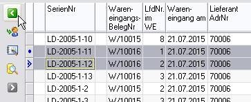 Im rechten Bereich erscheint eine weitere Tabelle. Wenn Sie nun auf eine Artikelzeile bzw. auf eine der Artikelzeile zugehörigen Seriennummernzeile in der linken Tabelle klicken, werden in der rechten Tabelle die zur Verfügung stehenden Seriennummern zu diesem Artikel angezeigt.