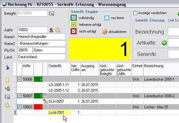 Nun geben Sie für klicken Sie auf die Seriennummernzeile von Artikel "Locher - blau 25". Hier geben Sie direkt die Seriennummer in die Spalte SerienNr ein.