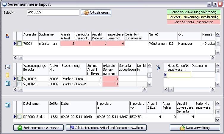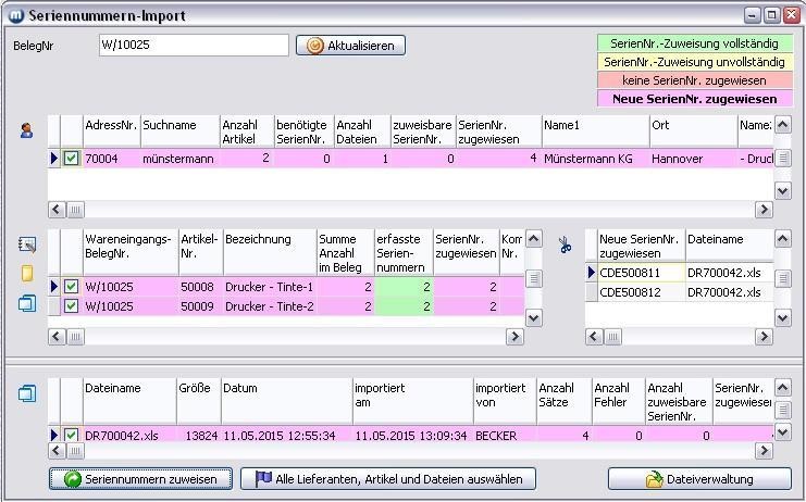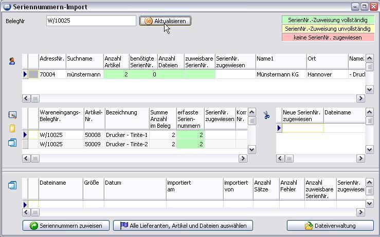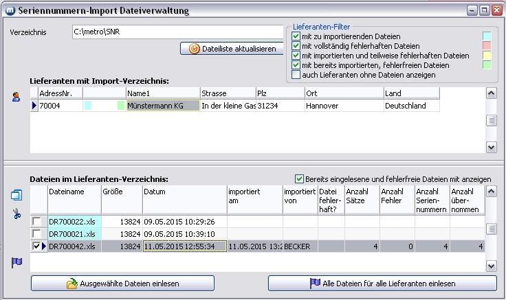 2. Das Formular Seriennummern-Import wird geöffnet und die Dateien aus dem Lieferantenverzeichnis eingelesen. Beispiel: