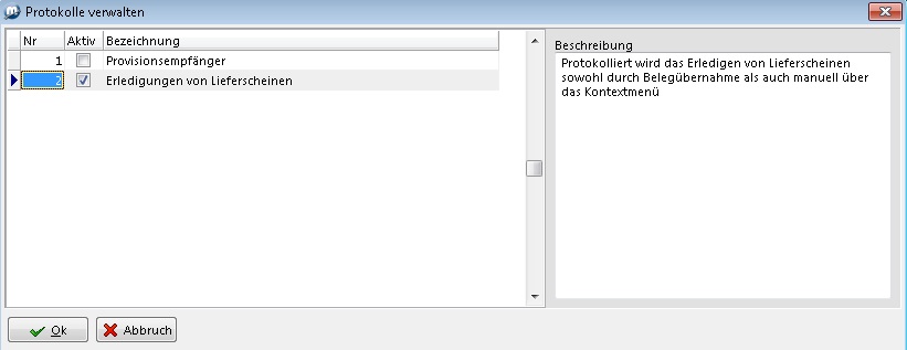 Über die Funktion können manuelle Benutzeraktivitäten (hier:Änderung Provisionsempfänger, Erledigung von Lieferscheinen) protokolliert werden. Die Daten können per dynamischer Suche über die Tabelle PROTOKOLL.adt ausgewertet werden.