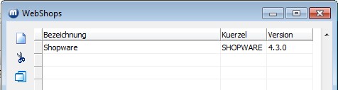 Rufen Sie das Menü Dienste/WebShop/Parameter/Shopsysteme auf. Erstellen Sie dort einen Eintrag für Shopware mit einer frei wählbaren Bezeichnung, dem in Großbuchstaben geschriebenes Kuerzel "SHOPWARE" und der Version "4.3.0".