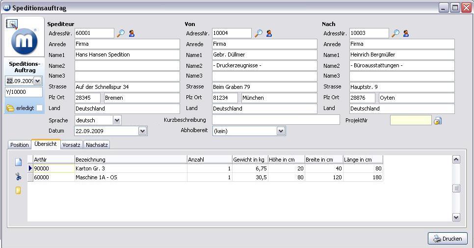 Der Speditionsauftrag ist ein eigenständiger separater Beleg. Er kann nicht aus anderen Belegen heraus erzeugt und auch nicht in andere Belege übernommen werden.