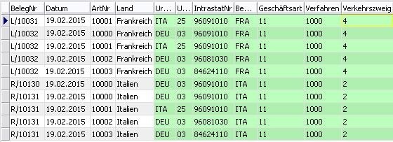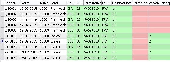 [In diesem Beispiel wurden die Spaltenbreiten für Ursprungsland (hier: Ur...), Ursprungsregion (hier: U...) und Bestimmungsland (hier: Be...) verkleinert.]