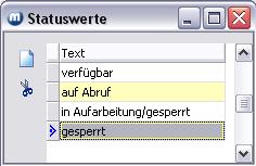 Im Menü Allgemeines/Maschinenverwaltung/Parameter/Statuswerte können Statuswerte wie "Verfügbar", "auf Abruf", "in Bearbeitung", usw. definiert werden. In der Maschinenkarte kann der Status einer Maschine bestimmt werden. Wird ein Status zu einer Maschine gesetzt oder verändert, erscheint die Abfrage, ob die Änderung in die Historie aufgenommen werden soll. Beispiel für Statuswerte:
