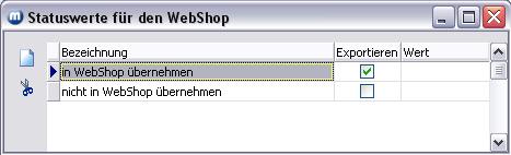 Über das Menü Dienste/WebShop/Parameter/Statuswerte geben Sie die Parameter zum "Webshop-Export" (hierbei muss das Kontrollkästchen in der Spalte Exportieren aktiviert werden) bzw. zum "Nicht-Webshop-Export" ein. Die Spalte Wert ist z.Zt. ohne Bedeutung.