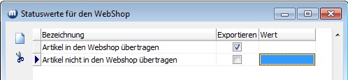 Über die Statuswerte wird gesteuert, ob ein Artikel in den Webshop übertragen werden soll oder nicht. Die Bezeichnung können Sie frei wählen. In der Spalte Exportieren muss dort ein Häkchen gesetzt werden, wo eine Übertragung erfolgen soll. Die Statuswerte werden später im Artikelstamm, im Register Webshop zugeordnet.