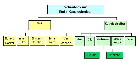 Eine Stückliste kann aus einzelnen Stücklisten-Elementen bestehen, die wiederum selbst eine Stückliste mit Stücklisten-Elementen ist. Die Stücklistenhierarchie kann beliebig viele Ebenen haben.