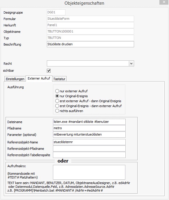 Übergabeparameter zum Dirketaufruf des Stücklistendruckes