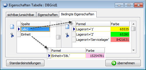 Das Hinterlegen von Farbcodierungen bzw. Schriftart, -größe, -farbe und -stil für Spalten einer Tabelle erfolgt im Register Bedingte Eigenschaften.