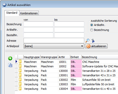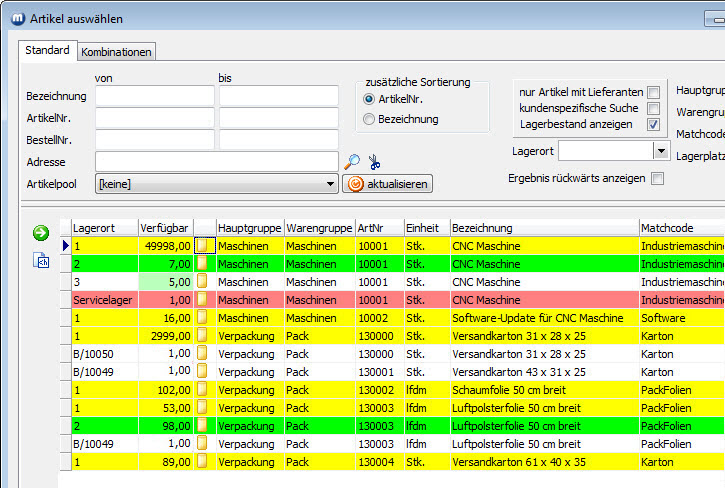Beispiel: Lagerorte farbig darstellen - gesamte Zeile. (Das Kontrollkästchen Lagerbestand anzeigen muss in diesem Fall aktiviert werden, damit Lagerdaten angezeigt werden.)