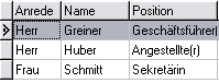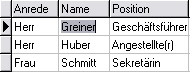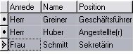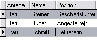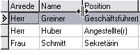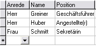 Ist die Spalte der neuen Zeile ein Eingabefeld, geben Sie sofort die gewünschten Daten ein. Ist die Spalte ein Listenfeld, erscheint nach dem zweiten Mausklick bzw. durch das Drücken der RETURN- oder LEER-Taste ein Pfeil. Um die Liste aufzurufen, klicken Sie mit der Maus auf diesen Pfeil oder drücken Sie die ALT-PFEIL-UNTEN-Taste. Um einen Listeneintrag in die Tabellenspalte zu übernehmen, klicken Sie auf den gewünschten Listeneintrag mit der Maus. Sie können sich auch mit der PFEIL-UNTEN/OBEN-Taste auf den Listeneintrag bewegen und den Eintrag mit RETURN übernehmen.
