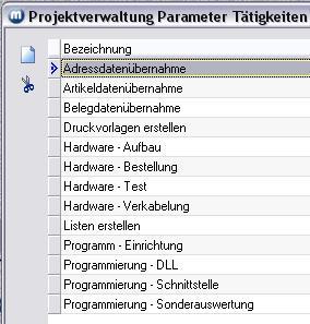 Rufen Sie das Menü Allgemeines/Projektverwaltung/Parameter/Tätigkeiten auf und tragen Sie die gewünschten Tätigkeiten ein.