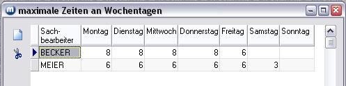 Über das Menü Allgemeines/Projektverwaltung/Parameter/Maximale Zeiten pro Wochentag werden die zur Verfügung stehenden Arbeitszeiten pro Tag und Mitarbeiter erfasst. Diese dienen später u. a. zur Berechnung der Projektgesamtbearbeitungszeiten.