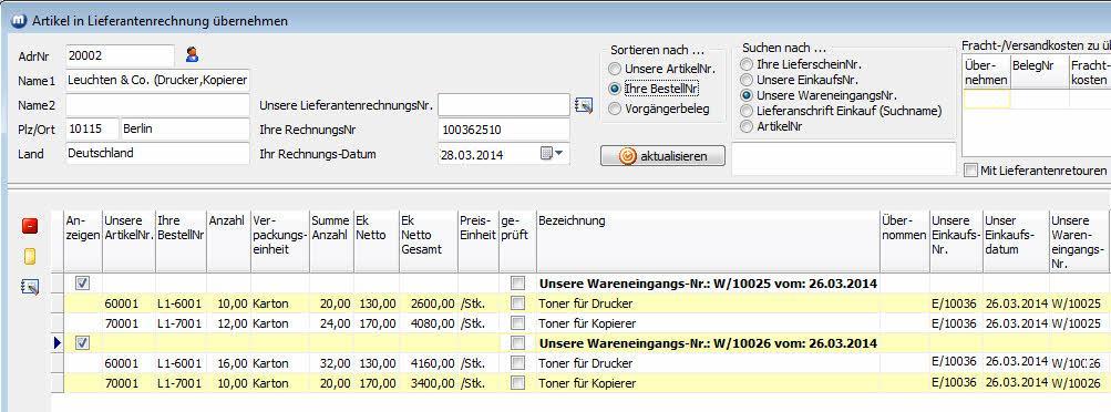 Nach erfolgter Datenübernahme werden die Wareneingangsnummern und die Datumsangaben der Wareneingänge in die Spalte Bezeichnung - oberhalb der jeweiligen Artikel - geschrieben.