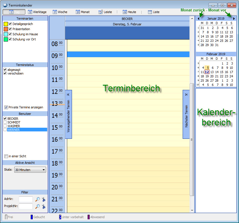 Die Monatsanzeige ist im Kalenderbereich auf jeweils 2 Monate beschränkt. Mit Klicken auf den Pfeil rechts bzw. links im ersten angezeigten Monats können Sie sich jeweils einen Monat nach vorne bzw. zurück bewegen.
