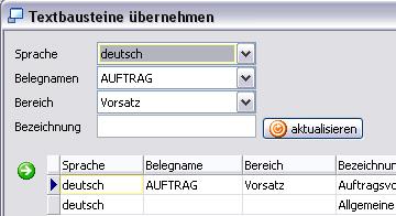 Vor der Übernahme eines Textbausteines können Sie jedoch den Belegnamen und/oder den Bereich wechseln, sodass Sie auch Textbausteine, die anderen Belegen/Bereichen zugeordnet sind, übernehmen könnten.