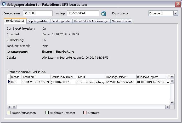Der Gesamtstatus ist: "Warte auf Rückmeldung vom Paketdienstleister". (Zur Erinnerung: Damit Rückmeldungen erfolgen können, muss ein Häkchen im Kontrollkästchens Rückmeldungen auswerten in der Konfiguration, Register Belege Register Export zu Paketdiensten gesetzt sein.).