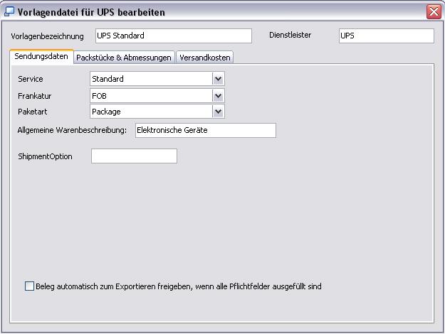 ShipmentOption: Das Feld kann leer gelassen werden. Es können aber auch Kürzel für ShipmentOption eingetragen werden, z.B. (gemäß UPS-Angaben):
