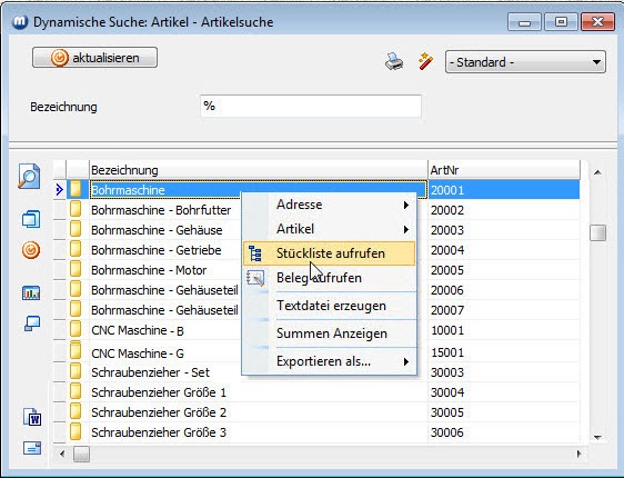 Hier im folgenden Beispiel handelt es sich um eine Artikelsuche. Dementsprechend können Sie hier die Kontextmenüs für den markierten Artikel aufrufen, eine Textdatei erzeugen lassen und die Daten in unterschiedliche Datenformate exportieren. Summen können nur angezeigt werden, wenn auch numerische Felder in der Suche vorhanden sind.
