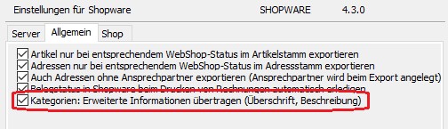 Haben Sie diese Kategorie bereits in Shopware hinterlegt und verwendet und erfolgt die Datenpflege in Shopware, muss das Kontrollkästchen deaktiviert sein. Ansonsten werden die vorhandenen Texte überschrieben und sind unter Umständen nach einer Übertragung leer!