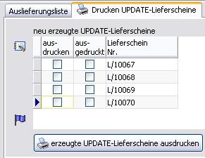 Um die Lieferscheine auszudrucken, markieren Sie die Zeilen der Spalte ausdrucken und klicken Sie dann auf den Button erzeugte UPDATE-Lieferscheine ausdrucken.