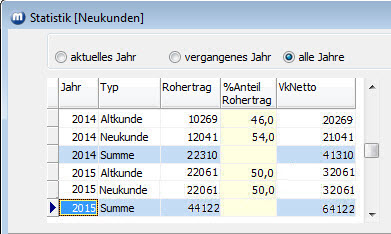 Die Statistik kann für das aktuelle Jahr, für das vergangene Jahr oder für alle Jahre erstellt werden. Wählen Sie eine der Optionen und klicken Sie dann auf den Button Erstellen. Im linken oberen Bereich der Statistik werden die Gesamtdaten je Jahr nach Alt- und Neukunden aufgegliedert. In der Spalte %Anteil Rohertrag sehen Sie wie sich der Gesamtrohertrag zwischen Neu- und Altkunden verhält. In dem Beispiel entfielen im Jahr 2014: 54,0% des Rohertrages auf Neukunden und 46,0% auf Altkunden.