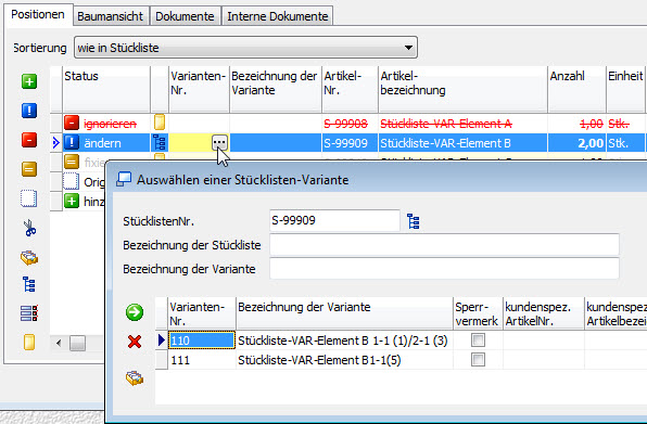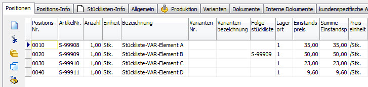 handelt. Die Spalten Varianten-Nr. und Bezeichnung der Variante beziehen sich auf eine Variante, die für eine Variantenposition mit Stückliste ausgewählt wurde. (In diesem Beispiel könnte - falls vorhanden - nur für die Position S-99909 eine Variante vorhanden sein.)