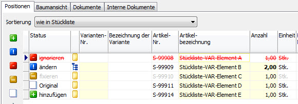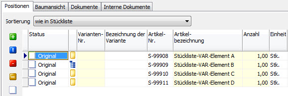 In der Spalte Status steht der Eintrag "Original". Werden Änderungen an der Position vorgenommen, erscheint dann dort das entsprechende Zeichen der Abweichung von der Original-Stückliste. Neben dieser Spalte wird anhand der Grafik angezeigt, ob es sich bei der Artikelposition um einen "normalen" Artikel