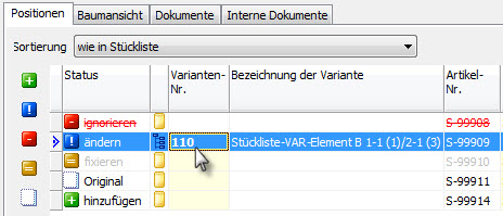 Zu a): Sie haben zwei Möglichkeiten: entweder wird der Artikel-Nr. S-99908 komplett aus der Variante gelöscht oder Sie markieren den Artikel als "ignoriert" - (Vorteil: der Vergleich zur Original-Stückliste bleibt erhalten).