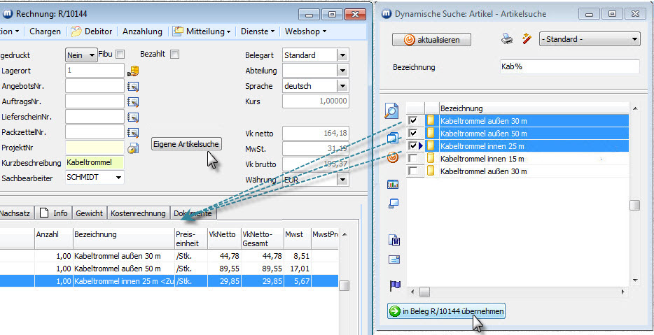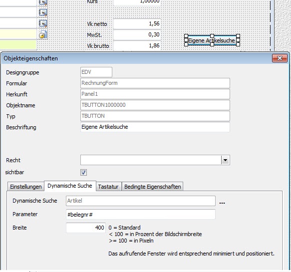 Beispiel: In eine Rechnung sollen Artikel per dynamischer Suche ausgewählt und übernommen werden. Zum Aufruf der dynamischen Suche soll ein Button in die Rechnung eingefügt werden, der die Suche rechts neben dem Beleg öffnet. In den Stammdaten wurde die Option Übernahme der Artikel in festen Beleg, Aufruf aus Belegfenster erforderlich gewählt.
