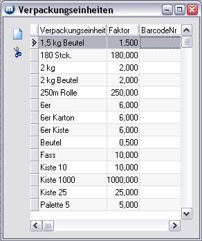 Der Faktor für die Verpackungseinheit muss eingetragen werden. Er bezieht sich auf das Verhältnis von Grundeinheit (des Lagers) zu Verpackungseinheit. Beispiel 1: Grundeinheit: kg, Verpackungseinheit: 1,5 kg Beutel => Faktor = 1,5.