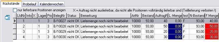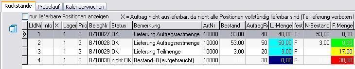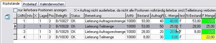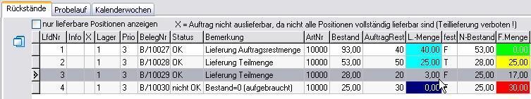 Von oben nach unten wird der Lagerbestand automatisch auf die Liefermenge (L.-Menge) verteilt. Für den Auftrag B/10029 ergibt sich somit nur die Möglichkeit einer Teillieferung von 3 Stck. Es ist eine Fehlmenge von 17 Stck. zu verzeichnen. Der Auftrag B/10030 kann nicht mehr bedient werden.
