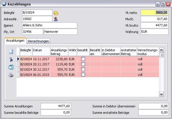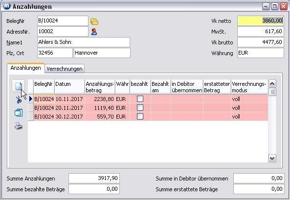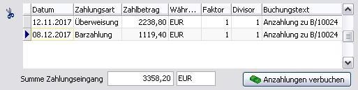 4. Gehen wir jetzt von der Annahme aus, dass die erste Anzahlung (für das Datum 10.11.2017) per Überweisung eingetroffen ist. Klicken Sie im Formular Anzahlungen auf den Button