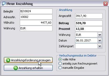 3. Im Bereich Anzahlung geben Sie den Betrag (oder auch die %-Zahl), die Währung und das Datum ein. Dann wählen Sie im Bereich Verbuchungsmodus im Debitor die Option volle Höhe und klicken auf den Button Anzahlungsforderung erzeugen.
