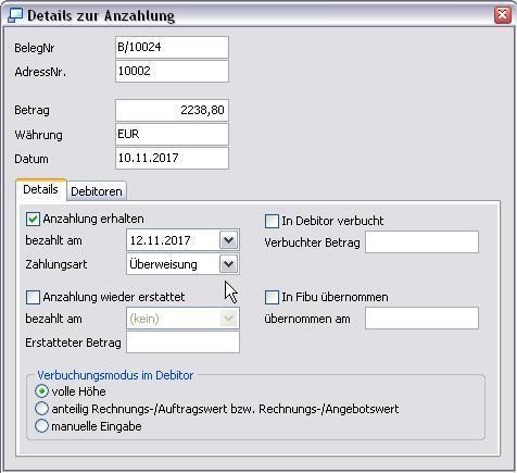 . Sie erhalten das Formular Details zur Anzahlung. In diesem Formular können Sie neben den Daten zum Erhalt der Anzahlung bzw. der Erstattung einer Anzahlung auch den Verbuchungsmodus im Debitor ändern. (Gehen wir davon aus, dass der Betrag weiterhin in "voller Höhe" übernommen werden soll.)