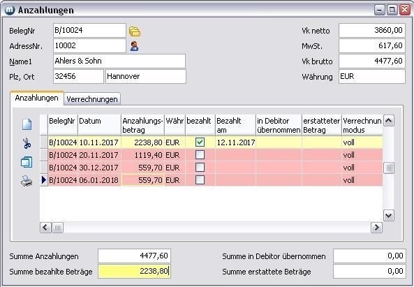 Gehen wir davon aus, dass auch der nächste Anzahlungsbetrag von 1.119,40 (2. Zeile der Tabelle) eingetroffen ist und entsprechend als "bezahlt" markiert wurde.