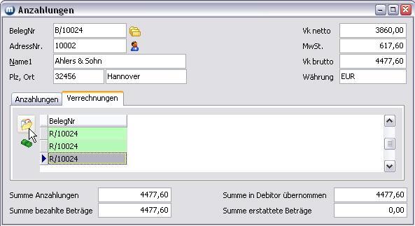 . Im Formular Debitor erfolgt die Verbuchung der Restbeträge über den Button Anzahlungen verbuchen. Die Verbuchung kann auch über den Button