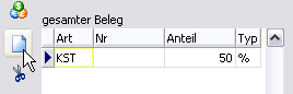 Beispiel: Haben Sie KST Kostenstelle und % Prozent gewählt und bei Anteil "50" eingetragen, wird beim Klicken auf den Neueingabe-Button z.B. in der Rechnung, Register Kostenrechnung sofort eine Zeile mit diesen voreingestellten Daten erzeugt.