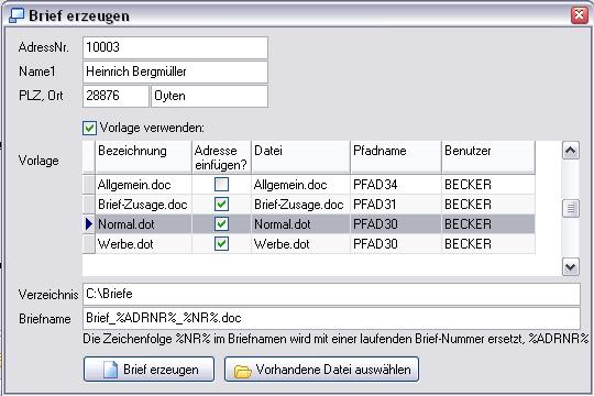 Rufen Sie die Stammdaten der Adresse auf, für die Sie einen Brief erstellen wollen. Klicken Sie im Register Briefe auf den Button Neueingabe um das Formular Brief erzeugen aufzurufen. Wie in der Grafik im Beispiel Vorlagen einrichten zu sehen ist, wurde "Normal.dot" als "Standard" gewählt und ist hier entsprechend bereits markiert. Das Kontrollkästchen Vorlage verwenden ist standardmäßig aktiviert. Wird es deaktiviert, wird ein zu erzeugender Brief ohne Vorlage erstellt.