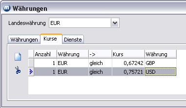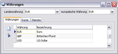 Über das Menü Finanzen/Währungen können Sie Währungen und Wechselkurse festlegen, ändern, löschen.