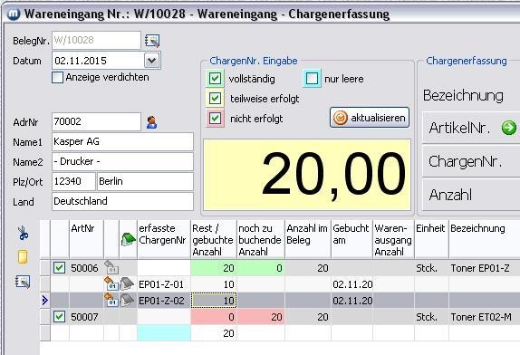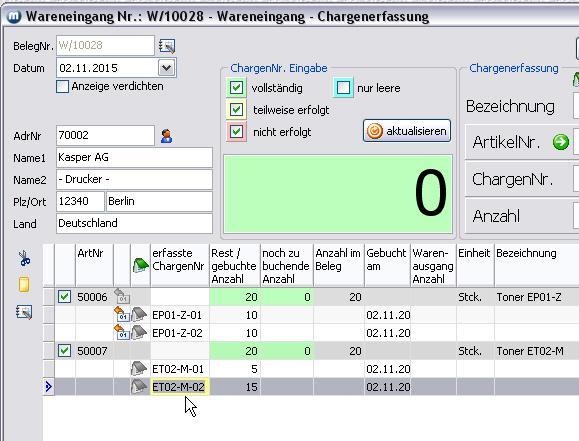 Sie klicken in die Spalte erfasste ChargenNr. unterhalb der Artikelzeile (hier für "Toner ET02-M"). Hier geben Sie die erste Chargenummer für den Artikel ein und in der Spalte Rest/gebuchte Anzahl die Menge der Charge. In der nächsten Zeile werden die restlichen Daten erfasst.