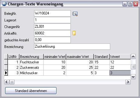3. Bei Chargenerfassung mit Grenzwerten (nur für Wareneingangsbeleg): Klicken Sie auf die Charge und dann auf den Button Texte zuweisen. In dem Formular Chargen-Texte Wareneingang sehen Sie die Texte und die zugehörigen Grenzwerte sowie den Standardwert. In die Spalte Istwert können Sie die Werte der Charge eingeben. (Entsprechen alle Istwerte dem Standard, können Sie auf den Button Standard übernehmen. klicken und die Zeilen werden automatisch in die Spalte eingetragen.)