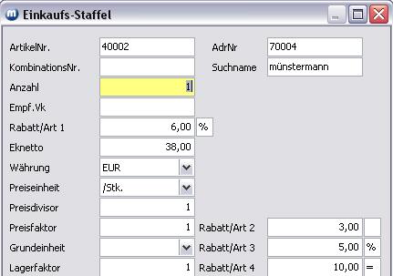 In dieser Tabelle können Artikelrabatte (je Lieferant) zugeordnet werden. Sie stehen an oberster Stelle der Rabatthierarchie im Einkaufsbereich.