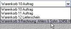 Solange ein Warenkorb nicht geschlossen wurde, kann er über die metropolis-Buttonleiste aufgerufen werden. Ist einem Warenkorb eine Adresse zugeordnet worden, wird diese in der Auswahl zusätzlich angezeigt.