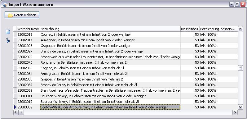 Um die Warennummern mit Masseeinheiten und Bezeichnungen aus der Datei "SOVA_...txt" (je nach Jahr wird der Dateiname um das Jahr ergänzt - Beispiel: SOVA_2007.txt) einzulesen, rufen Sie den Bereich Warennummern auf. Solange die Tabelle keine Daten enthält, können Spaltenbreiten nicht verändert werden.