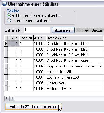 Um die Ihnen angezeigten Artikel in die Inventur zu übernehmen, klicken Sie auf den Button Artikel der Zählliste übernehmen. Schließen Sie das Formular.