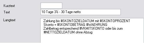 Wenn Skontobeträge und konkrete Zahlungsdaten in Ihren Belegen erscheinen sollen und nicht wie in der vorherigen Grafik zu sehen, ein bestimmter (immer gleicher) Langtext, müssen abweichende Eintragungen im Feld Langtext durchgeführt werden - zusätzlich zu den Eintragungen in den Felder SkontoProzent , SkontoTage und NettoTage.