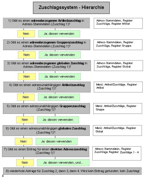 Folgende Übersicht zeigt Ihnen, wie das Zuschlagssystem hierarchiemäßig arbeitet. Dies gilt sowohl für den Verkaufs- als auch für den Einkaufsbereich.